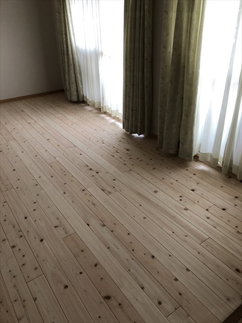 N様は無垢のフローリングをご希望だったので、特殊な遮音シートを施工し、無垢フローリングを張って仕上げました。無垢ならではの節の風合いや温かみを感じられるリビングになりました\(^o^)/